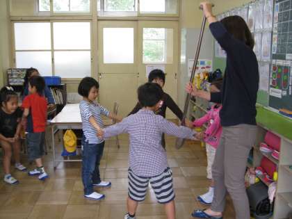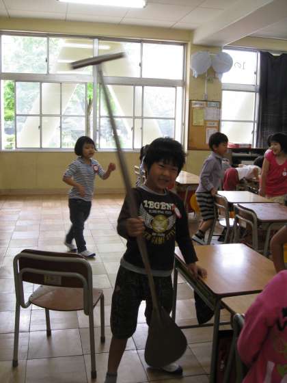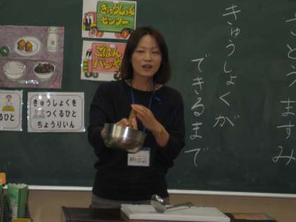 4人で手をつないだくらいの大きさのおなべでたくさんの給食ができます。