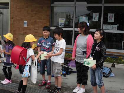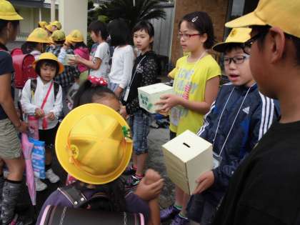 児童会では、学校の緑を増やすために、緑の羽の募金運動を行っています。