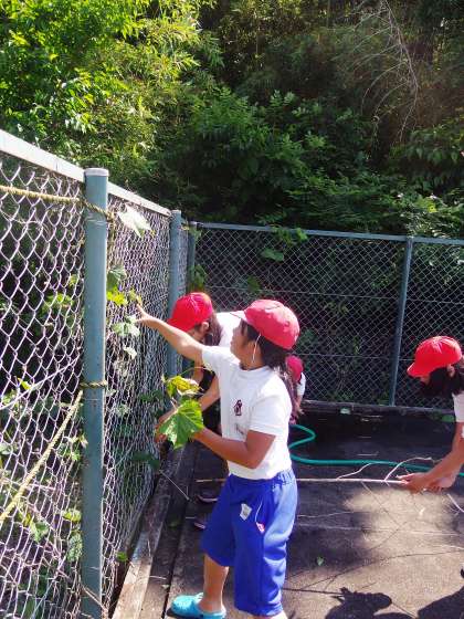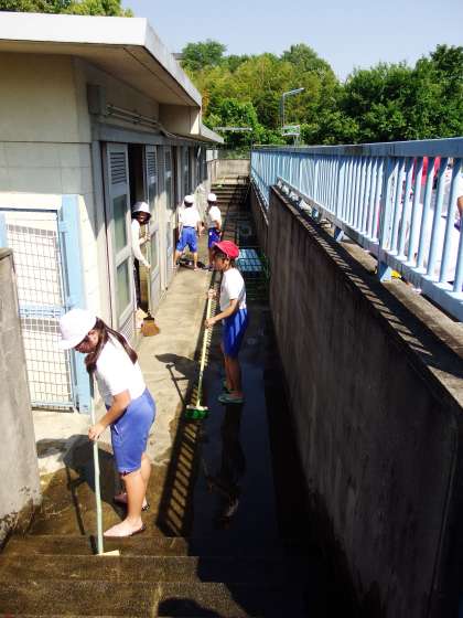 プール清掃の様子です。みんなで協力して学校のプールをきれいにしました。