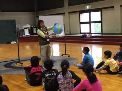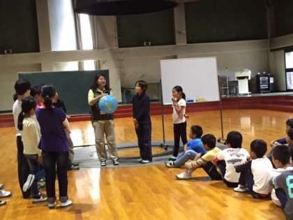 カッパを脱いでお茶を飲み、プレイホールで地球儀を使って、水のゆくえについて学習しています。