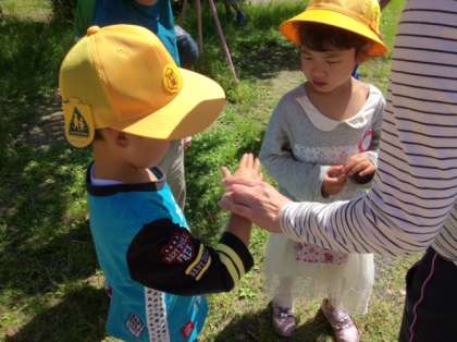 見たい、触ってみたい、匂いを嗅ぎたい、耳をすませたい、虫を見つけたいなど校庭でやってみたいことを決めて探検しました。