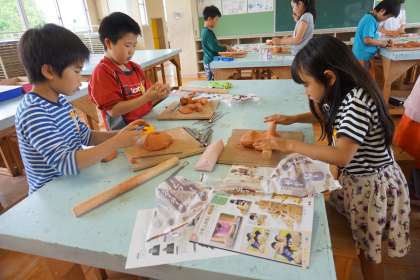 子どもたちは、ねん土を丸めたり、こねたり、のばしたりしながら、何をつくろうか一生懸命考え、自分なりのアイデアで作品づくりを進めました。