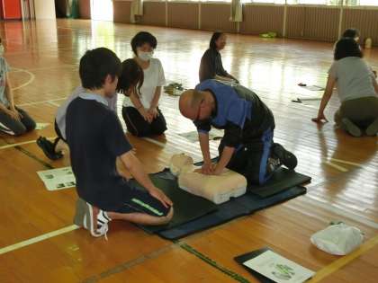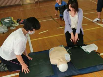 土曜参観・引き取り訓練のあと、午後からは教職員が、緊急時の対応の訓練をしました。意識がない場合の心臓マッサージやAEDの使い方を実際に役割演技して学びました。