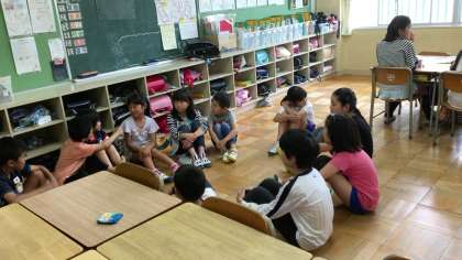 朝、なかよしタイムがありました。縦割りの班に分かれて自己紹介をしました。