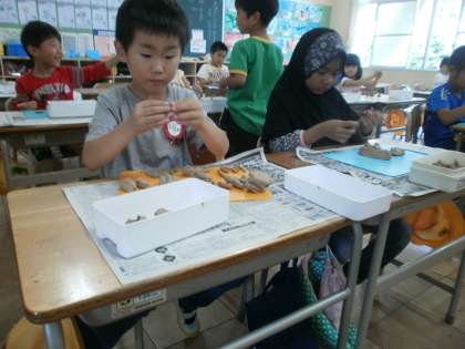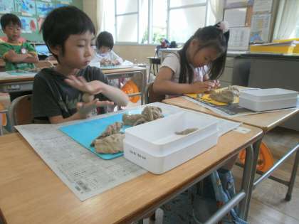 図工の学習で、粘土を使ってごちそうをつくりました。ハンバーガーやおすし、ケーキなど、夢中でつくっていました。どの作品も、とってもおいしそうにできました。