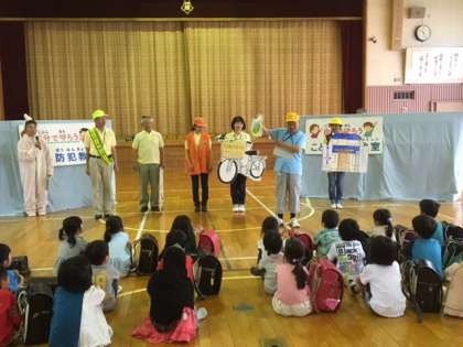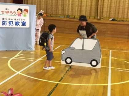 春日井市安全なまちづくり協議会、ボニターの方々が来てくださり、子ども防犯教室がありました。
