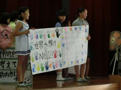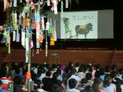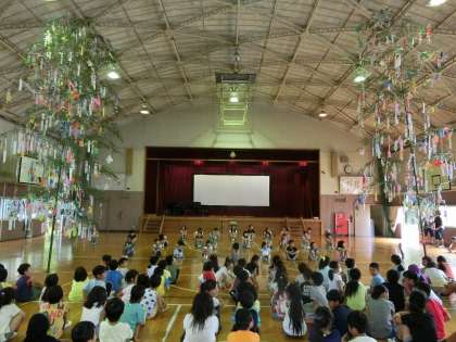 7月1日(金)1時間目に「七夕集会」を行いました。20mちかくある竹に一人一人願いを込めて短冊を結びました。また、クラスの代表の人が舞台でクラス目標を発表しました。