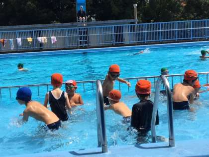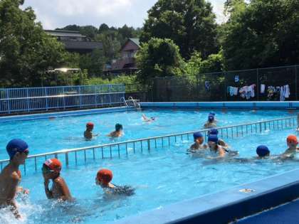 今日は55人の子どもたちが、プールに来ました。みんな、楽しそうに泳いだり遊んだりしています。