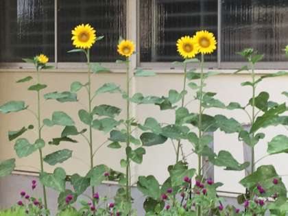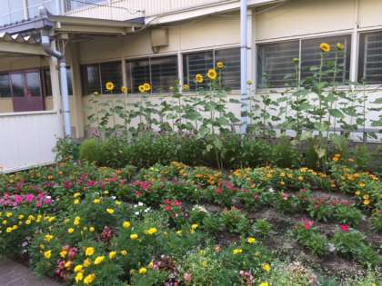 体育館前、花壇ボランティアさんの花壇のひまわりも咲きました!