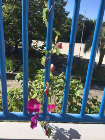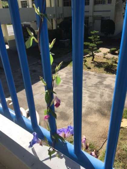 1年生が植えた朝顔が、2階校長室のベランダまで伸びてきました。すくすく育つ神屋っ子のようです。