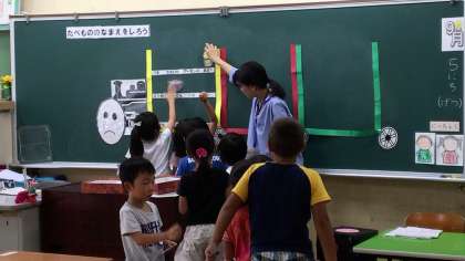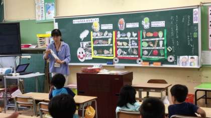 東部調理場の栄養職員さんが「たべもののなまえをしろう」という授業をしてくださいました。いろいろな食べ物の名前を覚え、それぞれの食べ物が体の中で、いろいろな大切な役目を果たしてくれることを学びました。