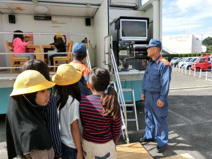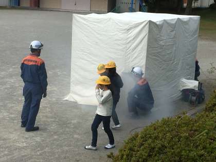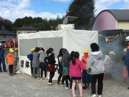 避難訓練2 公開日 2016/11/02 更新日 2016/11/02 学校行事 高学年は、煙道体験をしました。煙を吸い込まないようにハンカチで口を押え、姿勢を低くし、真っ白でよく前が見えない状態の中を避難する困難さを知りました。低学年はグラッキーで震度5強を体験しました。机をしっかりとつかんでいても、椅子が動いてしまいました。本当にこんなに揺れたら・・・と机の下にもぐり頭を守る大切さを知りました。