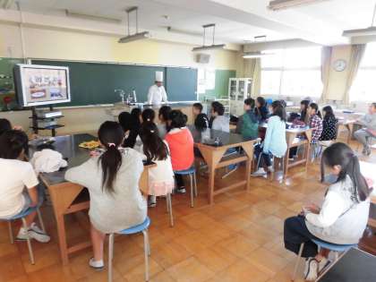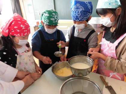 混ぜるのも協力してがんばりました。作った後は、五感の中の味覚について詳しく教えていただきました。