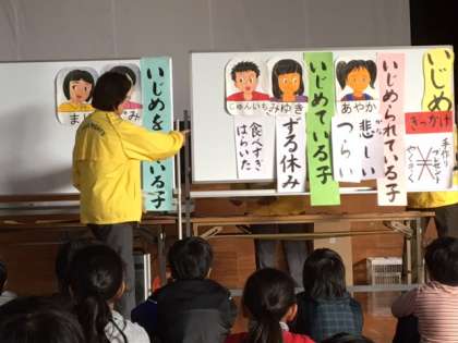 DVDを見て、いじめで学校に行けなくなった子どもの気持ちをみんなで考えました。いじめる子、いじめられる子、いじめを見ている子がいて、いじめを見て何も言わない子はいじめている子と同じ。という事を学習しました。