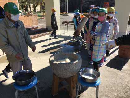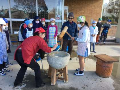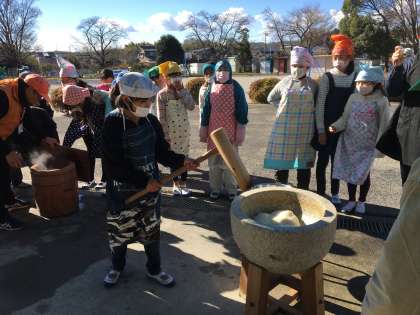 地域の方が、せいろで蒸してくれたもち米を、みんなでぺったんぺったんつきました。 おいしいお餅になあれ!