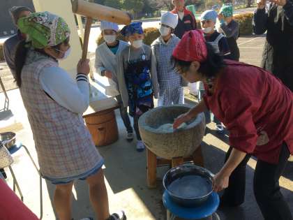 地域の方の田んぼを借りて、育てたもち米を使い、餅つきをしました。朝早くから、地域の方が来てくださり、湯を沸かしたり、まきで火をおこしたりして、準備をしてくださいました。ボランティアのお母さんたちに手伝ってもらい、つきあがった餅に、きな粉やあんこ、醤油をつけました。