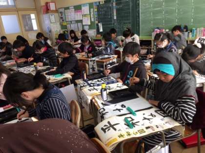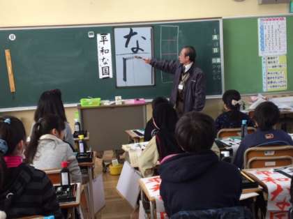 野田晴義先生のご指導で、「平和な国」を書きました。冬休みに書き初めで練習した字です。