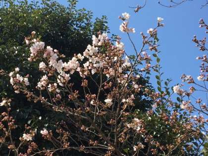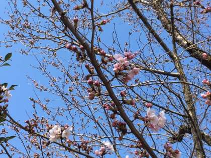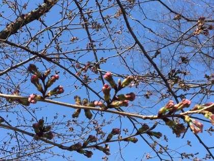 ソメイヨシノは、校庭西側は、まだまだ蕾が固いですが、校庭南側は、ほころび始めています。