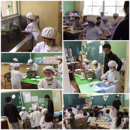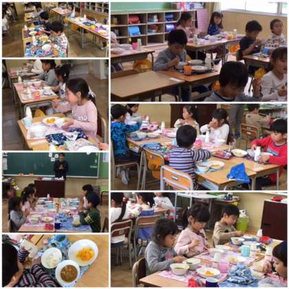 始めての給食1年生 公開日 2017/04/18 更新日 2017/04/18 1年生 当番の白衣をきて、自分たちで配膳をしました。 今日のメニューは、みんなの大好きなカレーとフルーツポンチです。 とても上手に早く準備ができました!はなまるです!