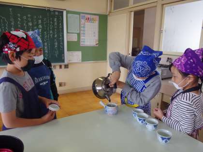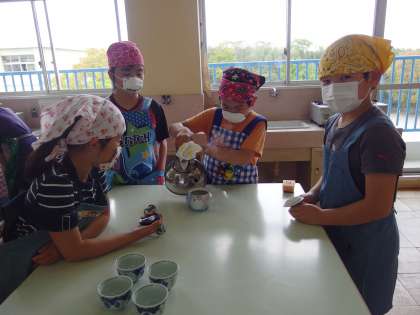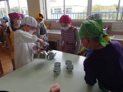 5年生は初めての調理実習でお茶を入れました。きゅうすにお湯を入れて蒸らしたり、湯飲み茶わんに同じ分量・濃さになるように注いだりと、おいしいお茶を入れるために、学習内容を振り返りながら取り組んでいました。自分たちで入れたお茶を飲むと、「苦い!」や「いいにおいがする!」等、感想を伝え合っていました。