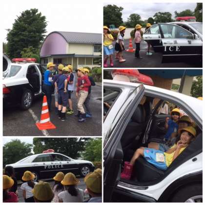 春日井警察署の方が来てくださり、警察官の仕事について、教えてくれました。パトカーにも乗せてもらい、子どもたちは、大変勉強になりました。