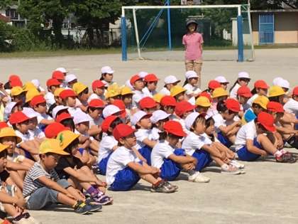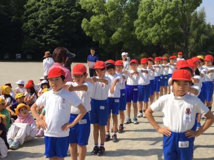 3回目の集団行動を行いました。今日は、「前に習え」と「体操体型に開け」の練習をしました。