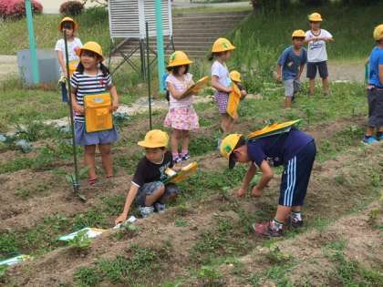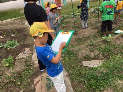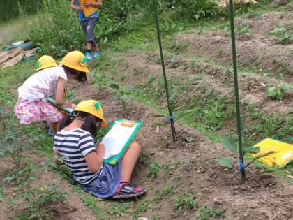 2年生は、生活科で野菜を育てています。ナス、オクラ、トマトなどの他に秘密の野菜もあります。苗が大きくなって来たので、支柱を立てました。