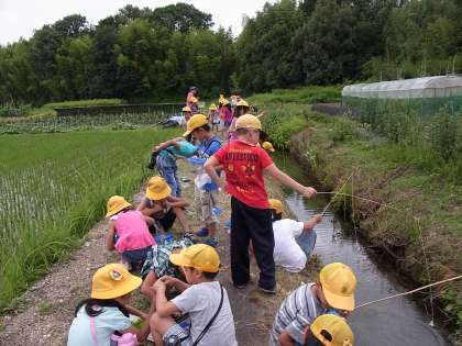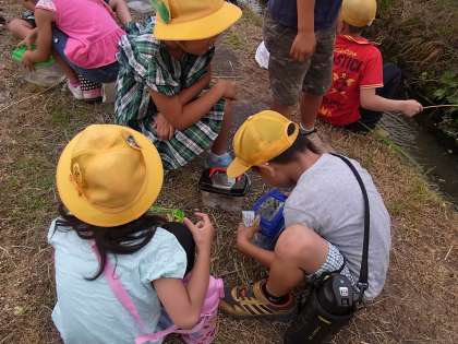 2年生がザリガニつりに出かけました。短い時間でしたが、いろいろなえさを使っていろいろな場所にいるザリガニを狙いました。小さなザリガニはすばしっこく釣ることがとても難しかったです。釣ったザリガニは虫かごに入れて帰ってきました。