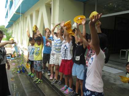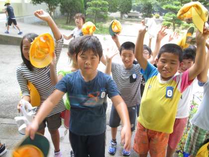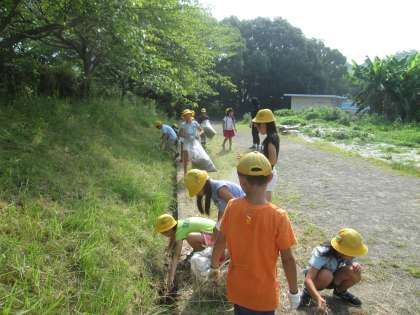 朝の業前の時間に、全校除草作業がありました。暑いので、子どもたちの体力を考え、高学年だけで行いました。先日環境ボランティアさんに刈っていただいた草を拾い、片つける作業を10分程度行いました。昇降口にミストシャワーを設置したので、教室に入る前、しばしの涼を味わいました。今日も、熱中症指数が31を超えた段階で、外での運動はやめさせ、教室で静かにすごさせる予定です。