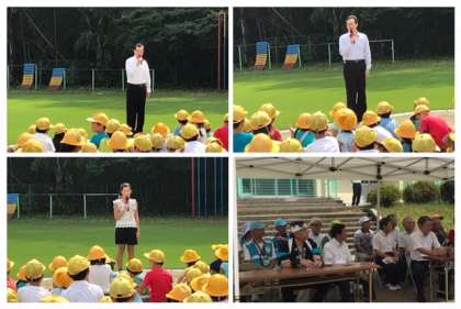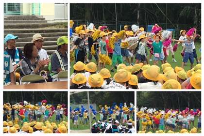 親子除草の後、芝生オープニングセレモニーを行いました。台風の後で心配しましたが、春日井市役所の方々が、復帰作業をしてくださり、芝生広場で行うことができました。学校長、春日井市長さん、市議会議長さんの挨拶の後、芝生の上で、1年生と2年生が「バナナくんたいそう」を披露しました。これは、春日台特別支援学校との交流会で踊ったものです。とても可愛く元気に踊れました。