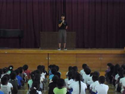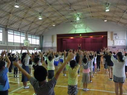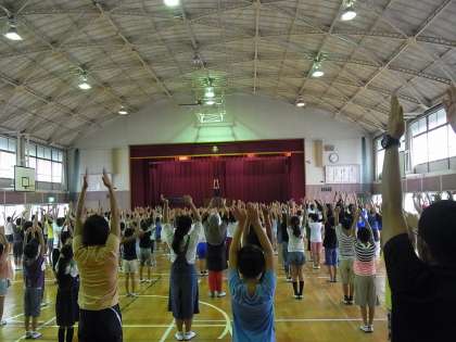 業前に集団行動訓練を行いました。今日はラジオ体操の練習でした。あいにくの天候だったため体育館で行いました。みんなで体操するには体育館は狭く、隣の人と手が当たらないように場所を決めてから行いました。1回通しただけでしたが、体がぽかぽか温まり、元気になりました。