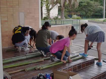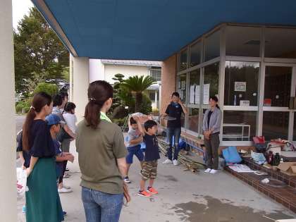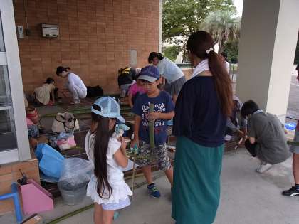 ふれあい教育セミナーが行われました。今回は「竹であそぼう!」というテーマで、竹を使ってもの作りを行いました。講師の先生のお話を聞いてから、まずは水鉄砲作りをしました。2種類の竹を組み合わせて筒とピストンを作りました。ピストンの先にスポンジを包んだ布を巻いて完成です。次に竹馬を作りました。手で握る部分と足を掛ける部分を切り出して組み立てました。両足作るので時間もかかりましたが、満足のいく出来映えでした。
