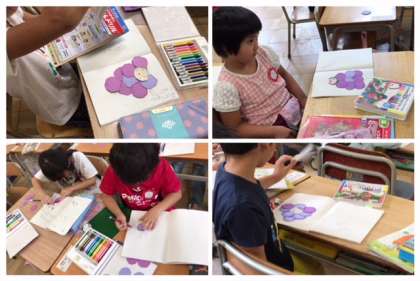 紫の紙を丸く切って、ブドウを作り、ブドウの中に自分の顔を入れた掲示物を作りました。