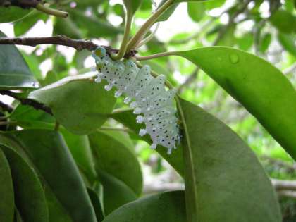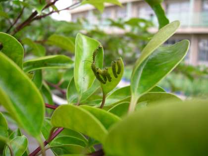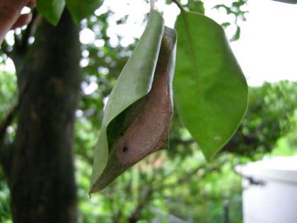校庭のクロガネモチの木で、6月の下旬に小さな幼虫をみつけました。観察をしていくと、見たこともないイモムシになり、7月下旬に糸を吐き茶色い繭(まゆ)をつくりました。何が出てくるか楽しみです。