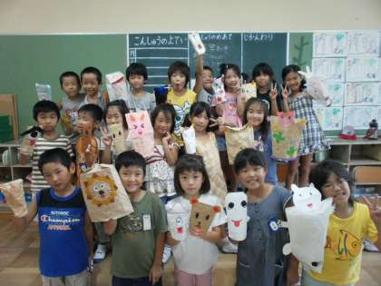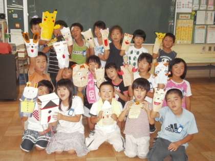 夏休みの宿題の「パペットをつくろう!」で作ったものをみんなの前で発表しました。