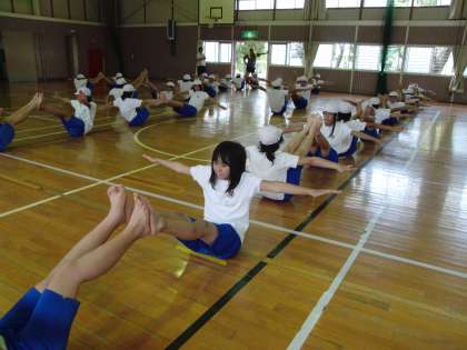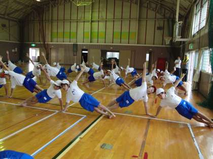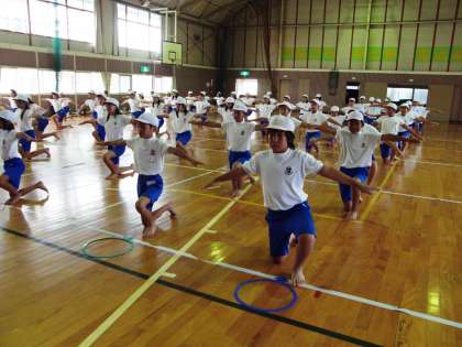 組立体操の練習2回目。今日は、6年生が2人組の見本を見せてくれました。さすがは6年生、動きもぴしっと決まっています。5年生も、6年生の演技を参考にしながら、暑い中、一生懸命練習に取り組んでいます。