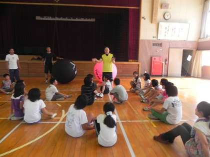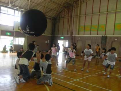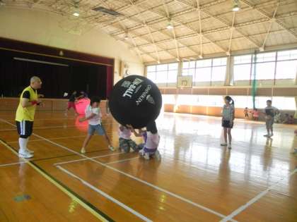 ボールに慣れたところで、いよいよ正式なルールで行います。4人1組のチームを3チーム作り、それぞれ「ブラック」「グレー」「ピンク」のゼッケンを付けます。はじめに、1つのチーム(たとえばブラック)が「オムニキン(これは合い言葉)、ピンク」と言ってボールを打ち上げます。そこでピンクチームがボールをキャッチできないと、他の2チームの得点になります。(分かったかな?)これを続けていって、得点の多いチームの勝ちになります。参加した子どもたちも、最初はよく分からない様子でしたが、すぐに慣れて、最後の試合では、どんどん夢中になりました。大きなボールの魅力、子どもでも参加しやすいこと、作戦を考える点など、とても楽しくて奥の深いスポーツだと思いました。