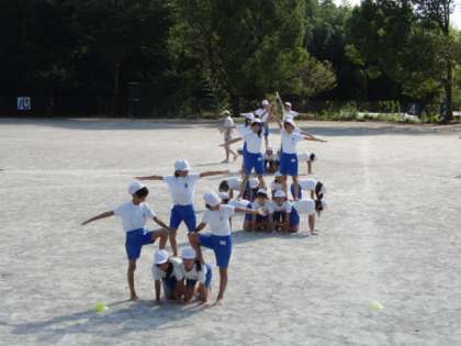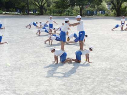 高学年の組立体操、かなり「いい感じ!」に仕上がってきました。今日は、運動場で5・6年の合同練習。5人技・6人技などの高度な技も上手にできるようになってきました。あとは、みんなの心を1つにして、さらに技の完成度を高めましょう。