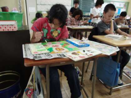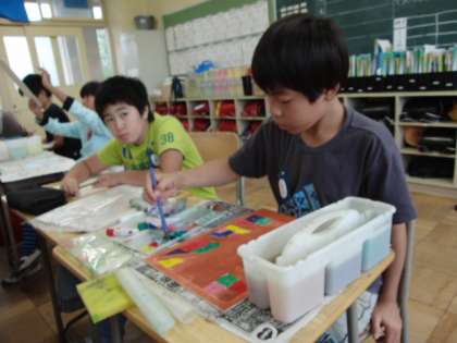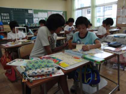 図工では「板を切り抜いて」という単元を勉強しています。1枚の板を切り抜いて、輪投げやジグソーパズルなどなどを作ります。それぞれ、アイディアをこらした下絵を描いています。どんな作品ができるかな?