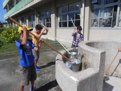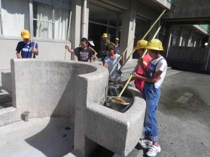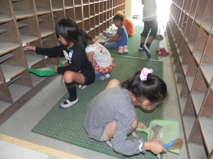 美化委員会の人たちが、昨日ワックスがけで使ったモップをきれいに洗ってくれました。昇降口では、靴箱をきれいにしている人たちがいました。すっきりしたね。