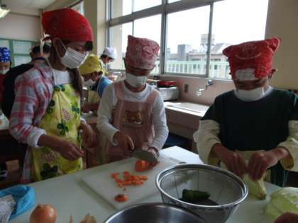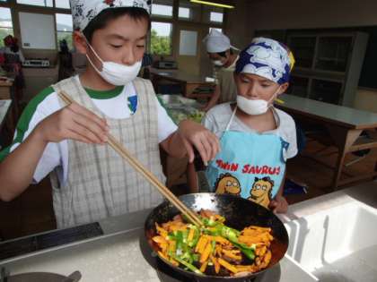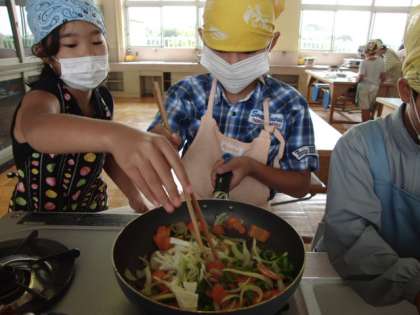 今日は「野菜炒め」の実習です。ポイントは、野菜を炒める順序や時間、それに火加減です。お家で、よくお手伝いしている人は、てきぱき手際よく進めていますね。
