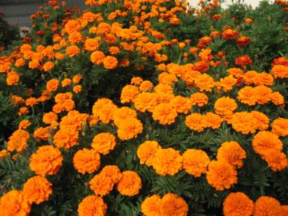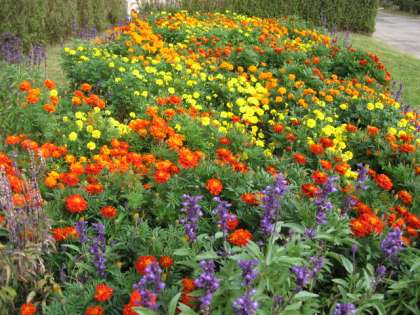 種から大切に育てたマリーゴールド、サルビアの花が今まさに満開です。美しい学校環境でみんなの心も和みます。(野崎)