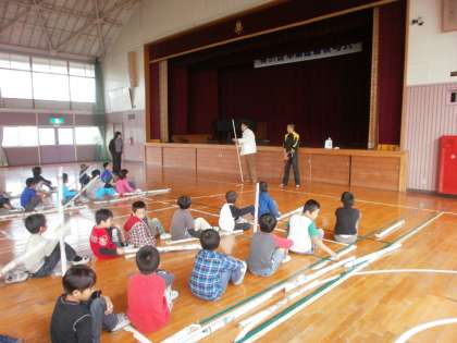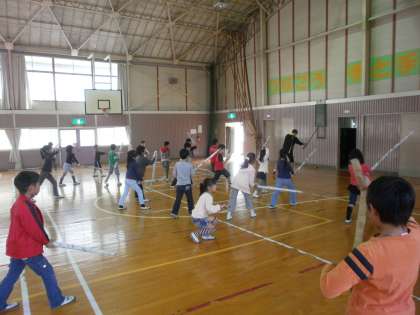 総合の時間に伝統行事である「棒の手」を教えていただきました。名前は知っていてもどんなものなのか詳しくは知らない子も多く,みんな興味津々です。