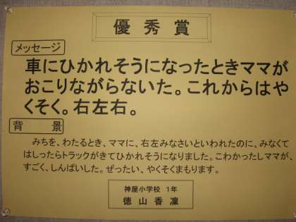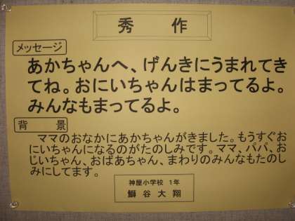 市内で7名の受賞者の内、なんと神屋小学校1年生の2名(徳山さん、鰤谷くん)が受賞しました。市民会館のロビーに掲示された作品を紹介します。(野崎)