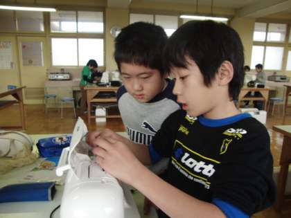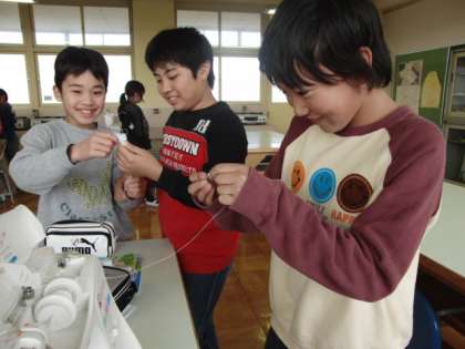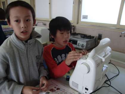 家庭科の勉強はエプロン作り。今日は1組が、ミシン・デビューの日。慣れない手つきで、一生懸命作業しています。さぁ、ミシンに正しく糸をかけることができますか?