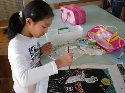版画が彫りあがって、印刷の段階に入っている人もいます。自分で彫った絵が、刷り上がったときの感動はいいものですね。
