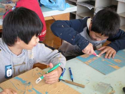 5年1組の図工です。板を彫るのは、なかなか時間と根気が要りますが、子ども達は、一生懸命取り組んでいます。
