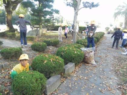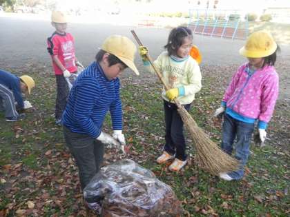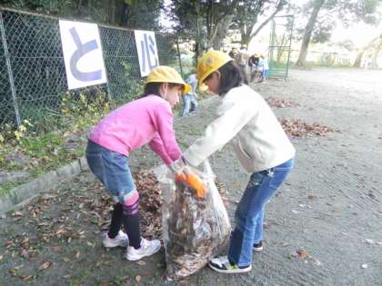 今朝の業前は、落ち葉拾い。秋も深まり、校庭には落ち葉がたくさん。みんなで協力して落ち葉を集めました。
