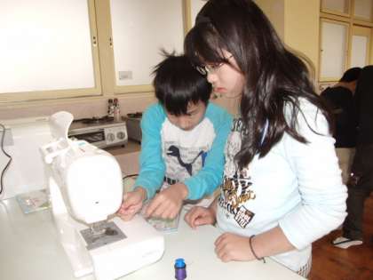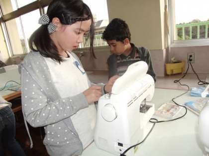 今日は、ミシンの基礎練習の続きです。ボビンを巻き、上糸を通し、直線縫いの練習です。なかなか上手に糸が通りません。お母さん達は、お家でどうやっているのでしょうか?ミシンのコツを、お家の人に聞いてみましょう。