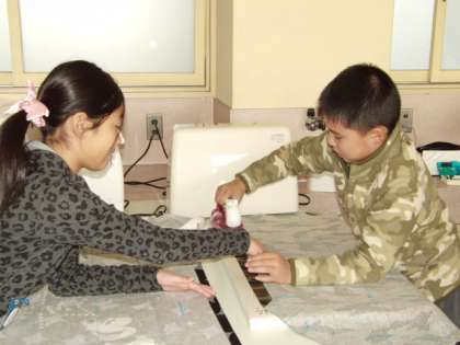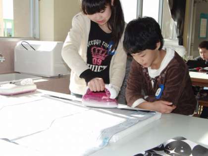 今日から、エプロン制作に入りました。まずは、型紙通りに、布をはさみで断ちます。それから、端を3つに折り、アイロンをかけます。最後に、ミシンで縫う前に、しつけをします。さあ、みんな上手にできるかな?